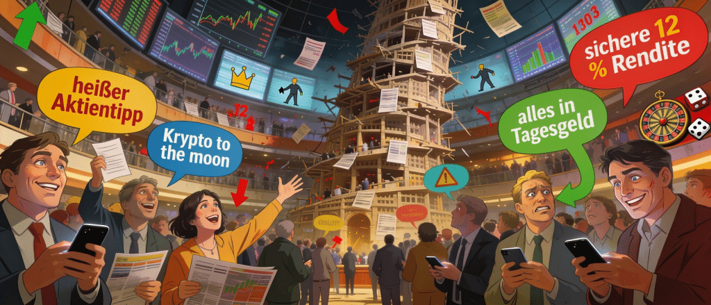 Ohne klaren Plan wird jede Marktbewegung zur Einladung, spontan zu reagieren. Wer nicht weiß, wofür er spart, wie lange das Geld arbeiten soll und welche Schwankungen ausgehalten werden können, lässt sich von Stimmungen treiben. Present Bias sorgt dafür, dass der kurzfristige Konsum oder die Erleichterung, heute nichts entscheiden zu müssen, wichtiger erscheint als die finanzielle Freiheit in 20 Jahren. Planungsoptimismus führt dazu, Risiken zu klein und zukünftige Sparleistungen zu groß einzuschätzen.
