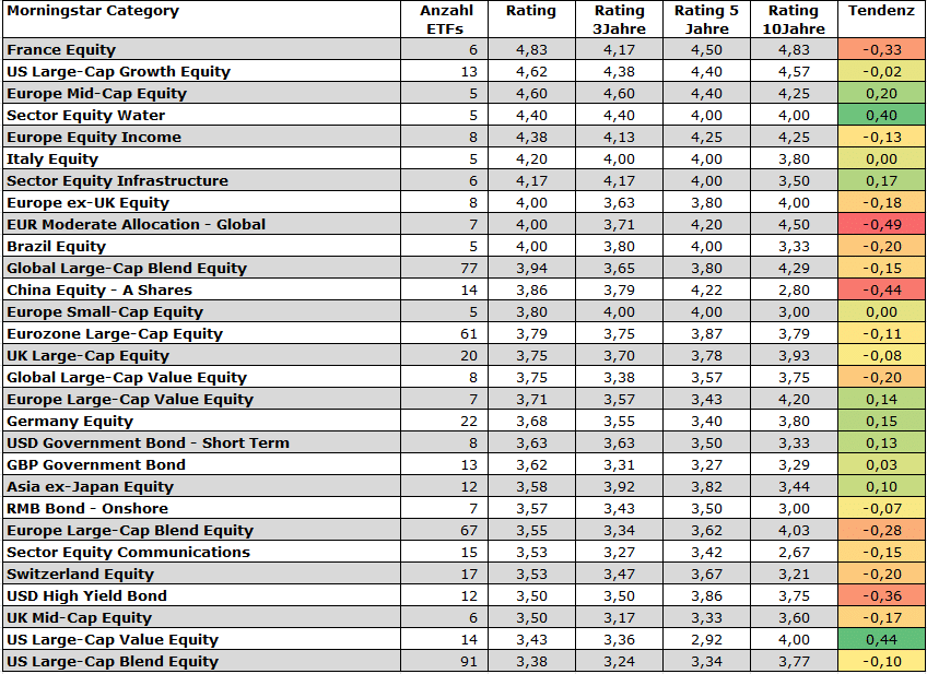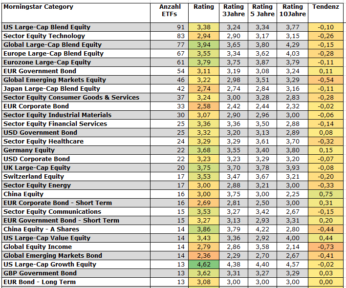 Ein Durchschnitts-Rating von mehr als 3,0 Sternen signalisiert ein überdurchschnittliches Rendite-Risiko-Profil von ETFs in einer gegebenen Kategorie, ein Rating von unter 3,0 Sternen deutet darauf hin, dass sich ETFs in der Kategorie nicht abheben konnten von aktiv verwalteten Fonds. Um die Rating-Dynamik einzufangen, haben wir auch die Rating-Tendenz aufgegriffen, indem wir den Spread zwischen den Drei- und Fünfjahres-Teilratings berechnet haben. Diese Tendenz finden Sie in den Tabellen in der Spalte rechts der jeweiligen Tabellen. Ein negativer Wert signalisiert ein schwächeres Kurzfrist-Teil-Rating, ein positiver Wert zeigt, dass ETFs kurzfristig besser abgeschnitten haben als in der Fünfjahres-Bilanz.