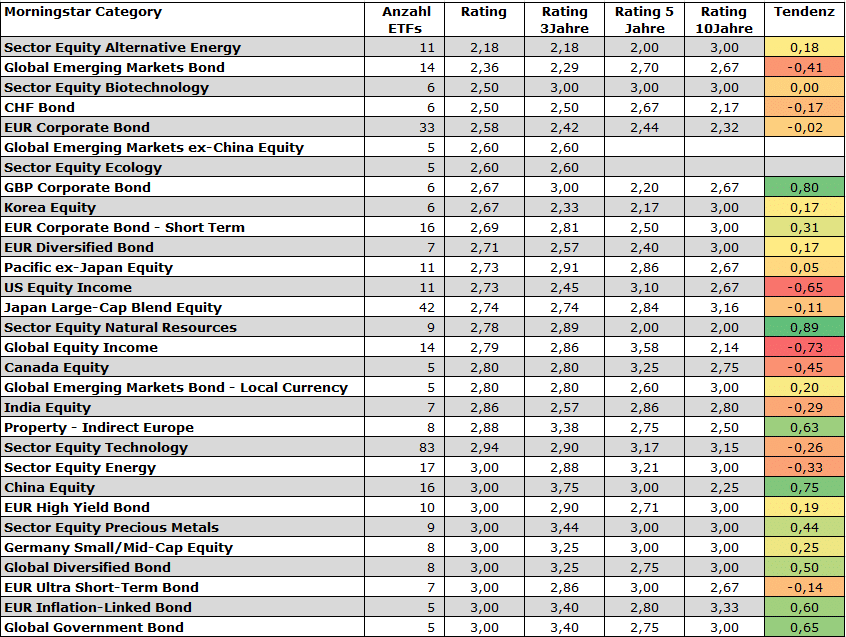 Die Rating-Tendenz überzeugt ebenfalls nicht. Die Kurzfrist-Ratings fallen mehrheitlich schwach bis stagnierend aus relativ zu den Fünfjahres-Teilratings, wenn es auch vereinzelt positive Trends gibt, etwa in den Kategorien Aktien China, Rohstoff-Aktien oder britische ETFs für Unternehmensanleihen.