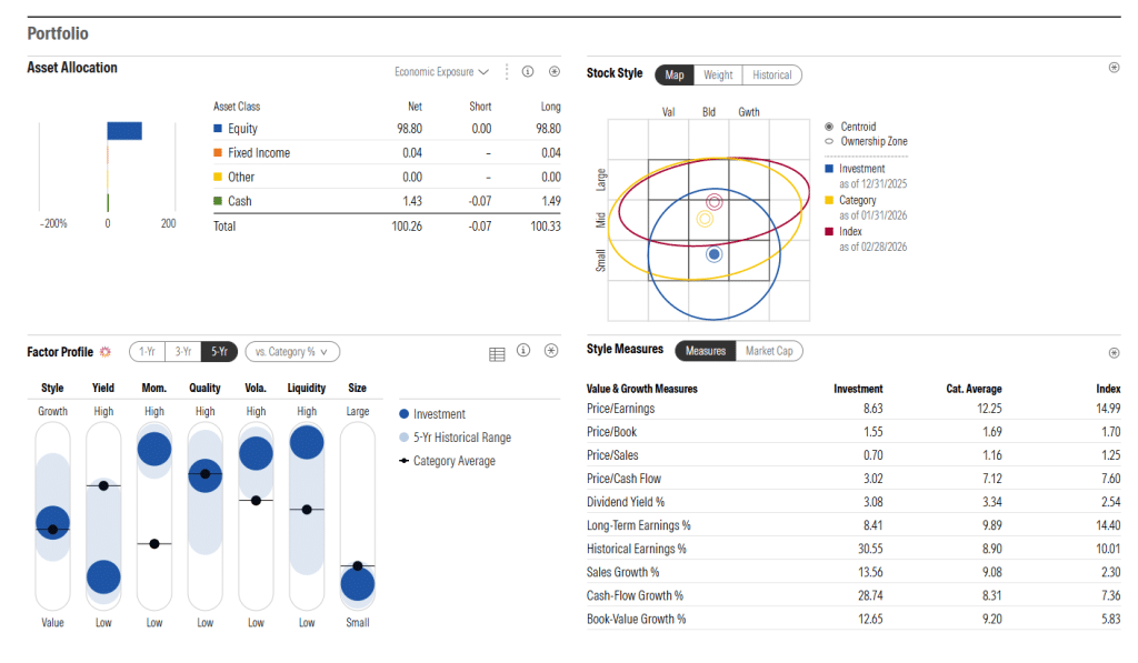 Der Fonds zeigt ein sehr ausgeprägtes Rendite‑Risikoprofil. Einerseits ist die Standardabweichung mit rund 16,5 Prozent deutlich über dem Nivea der Kategorie und des Index von jeweils rund 13 Prozent. Der maximale Verlust in dem Zeitraum war mit 38,6 Prozent ein Tick über Index‑ und Vergleichsfonds‑Niveau. Gleichzeitig fiel die Rendite wesentlich stärker aus, sodass das Sharpe Ratio mit etwa 0,67 über den 0,48 der Kategorie und 0,46 des Index liegt. Morningstar stuft den Fonds beim Risiko als „überdurchschnittlich“, bei der Rendite als „hoch“ ein.