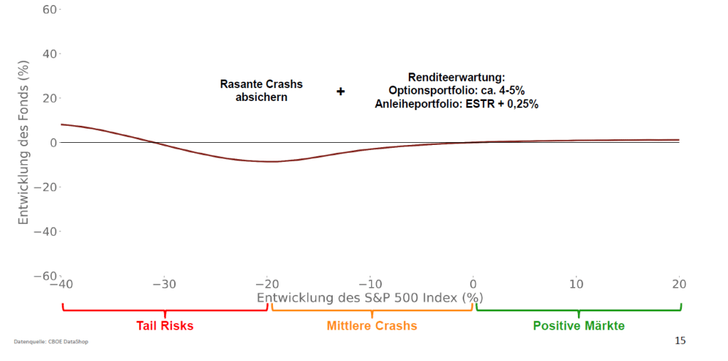 Wie performt der Fonds „planmäßig“? Steigen die Aktienmärkte, hat der Fonds das Ziel, eine Performance zwischen sechs und sieben Prozent nach Kosten zu erwirtschaften. Fallen die Aktienmärkte um weniger als 15 Prozent, wird er zumeist mittlere einstellige Verluste verzeichnen; schmieren die Aktienmärkte weiter ab, fangen die Absicherungen des Fonds an zu greifen. Dann lautet das Motto: je stärker die Aktienverluste, desto besser die Performance des Fonds. Bei mittleren zweistelligen Aktienverlusten kann der Fonds deutlich zulegen, wie das untere Schaubild illustriert. Diese Mechanik hilft immens in Panikphasen an den Märkten – nicht nur bei der Portfolio-Performance, sondern auch, was die Schonung der Nerven der Anleger (und Berater!) anbelangt.