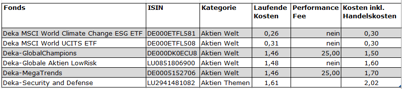 Das schlecht diversifizierte und mit Zielkonflikten beladene Portfolio weist übrigens einen weiteren Nachteil auf, der eine relativ schwache Rendite wahrscheinlich macht: Die Kosten sind hoch. Zusätzlich zu laufenden Gebühren von über 1,5 Prozent pro Jahr berechnet die Sparkasse bei aktiv verwalteten Fonds Ausgabeaufschläge. Zwei der Deka-Fonds haben zudem eine sogenannte Performance Fee, eine „Erfolgsgebühr“, die bei happigen 25 Prozent der Outperformance (Überrendite) liegt.